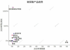玻尿酸產品發(fā)展至今,主要還是集中在護膚領域。雖然也有口服的保健品,但銷售額僅排在第五名。排在前面的護膚和醫(yī)美,是常見的玻尿酸用途,暫且不提,但成人用品和美發(fā)護發(fā)產品的銷售額和同比增長比保健品還高,就讓人非常驚訝了。