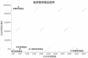 在玻尿酸保健品領域,片/膠囊類型保健品一騎絕塵,口服液類、沖飲類和果凍類保健品萎靡不振,倒是軟糖類保健品突出重圍,再一次成為了熱門新貴。
