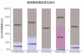 與此同時,在玻尿酸保健品當中,玻尿酸常常是與其他成分一起出現的,尤其是膠原蛋白,出現頻率非常高。對于單獨補充玻尿酸的保健品,消費者并沒有很心動。與其他成分強綁定,才能更為消費者接受。
