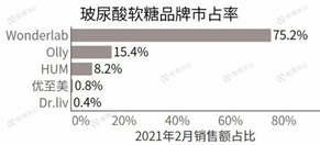 今年2月,市面上已經出現了一款玻尿酸食品——代餐品牌WonderLab推出的玻尿酸軟糖。 上市一個月后,WonderLab表現不俗,立刻搶下了第一名,把其他品牌遠遠甩在后面。要知道2020年,HUM的市占率達到了61%,Olly的市占率達到了38%。