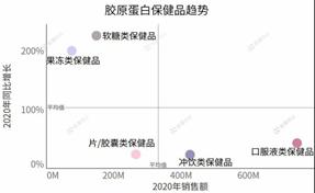 可以發(fā)現,除了餅干薯片外,其他產品大多是比較水潤、粘稠或有彈性的,加工過程較為健康,與膠原蛋白成分的形象比較類似。
