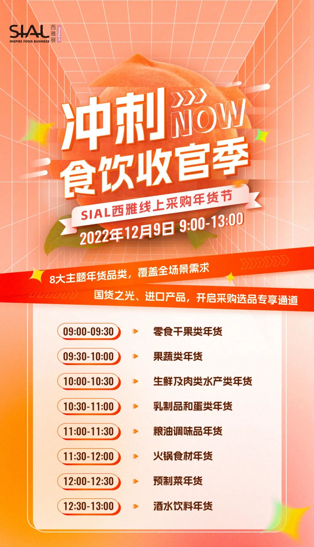 本次私域供需對接,將繼續(xù)以“SIAL西雅線上采購年貨節(jié)”8大年貨品類為依托,包括:零食干果類年貨、果蔬類年貨、生鮮及肉類水產年貨、乳制品和蛋類年貨、糧油調味品年貨、火鍋食材年貨、預制菜年貨、酒水飲料年貨等,通過SIAL西雅展私域社群,為食飲行業(yè)供應商和采購商提供商貿對接機會。